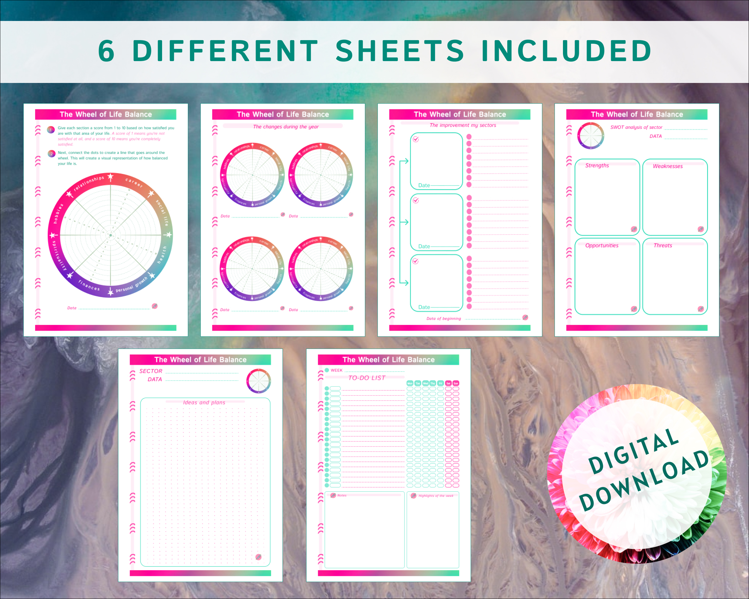 This 6-pack printable bundle will help you understand your starting point, track your progress, write out your goals, and check off daily tasks. This listing includes 6 different printable sheets: