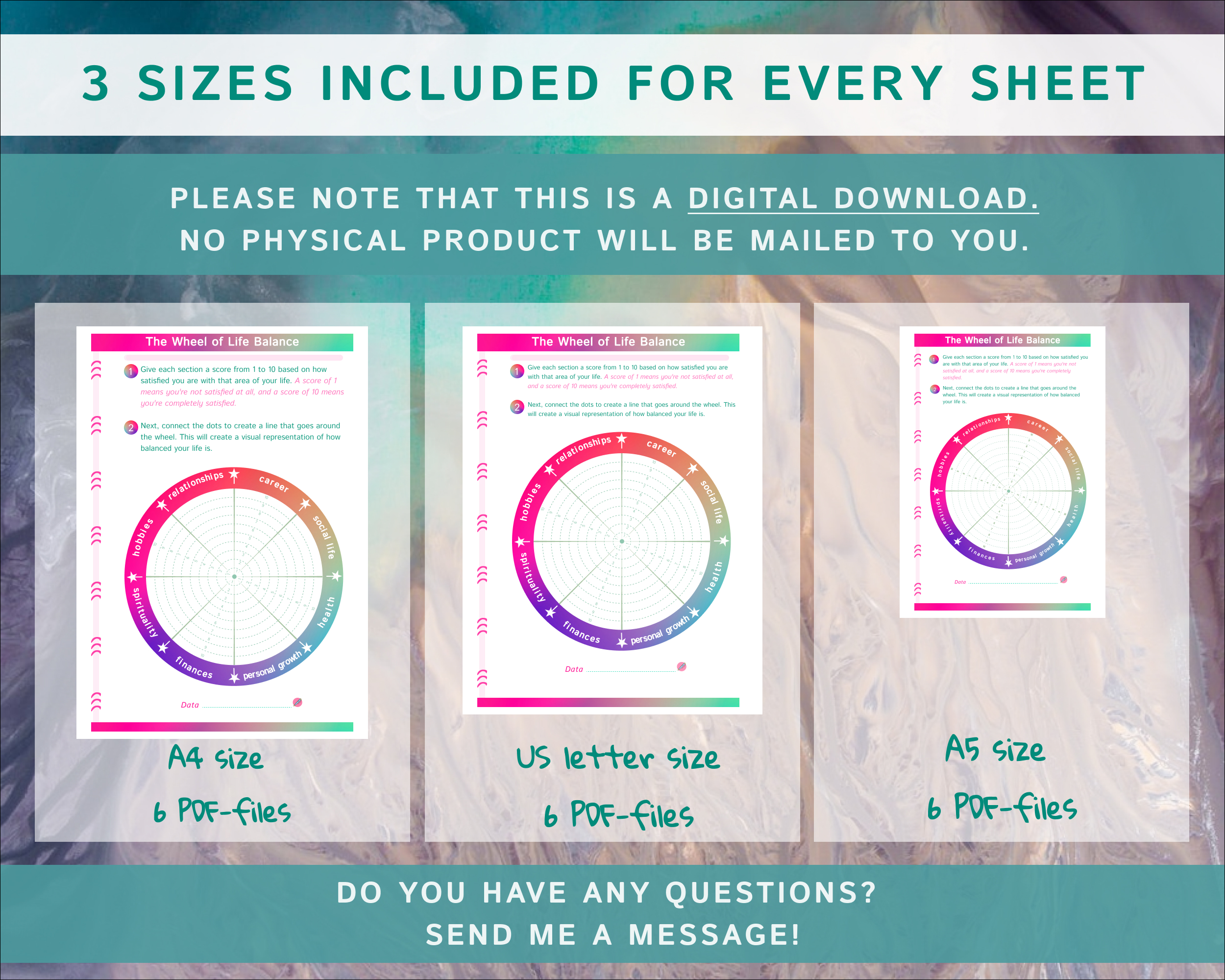 You will receive 18 PDF files in a zipped folder, including 6 different printable sheets in 3 sizes (A4, A5, US letter)